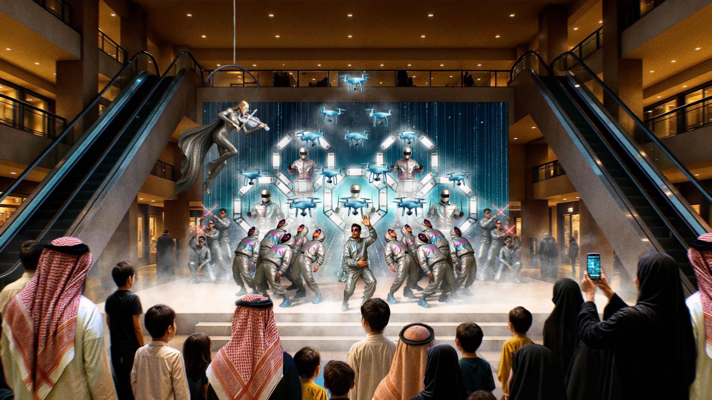LED drums, synchronized dance performance, and a live violin suspended in the air create a futuristic experience where music and technology merge into a single, immersive flow.