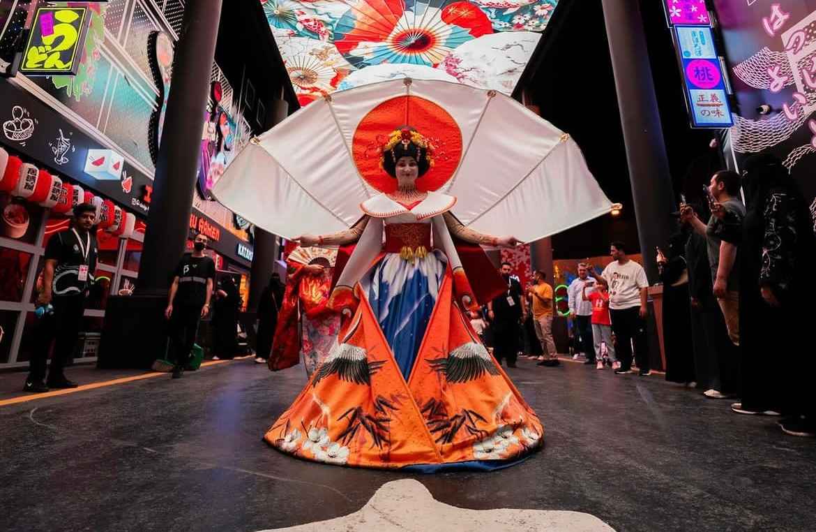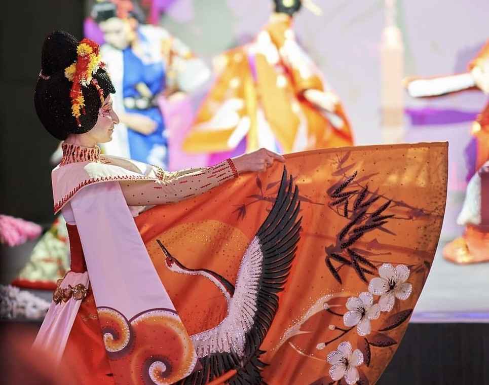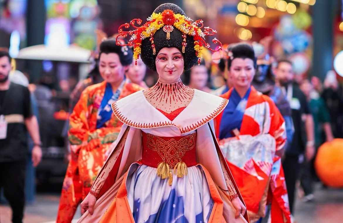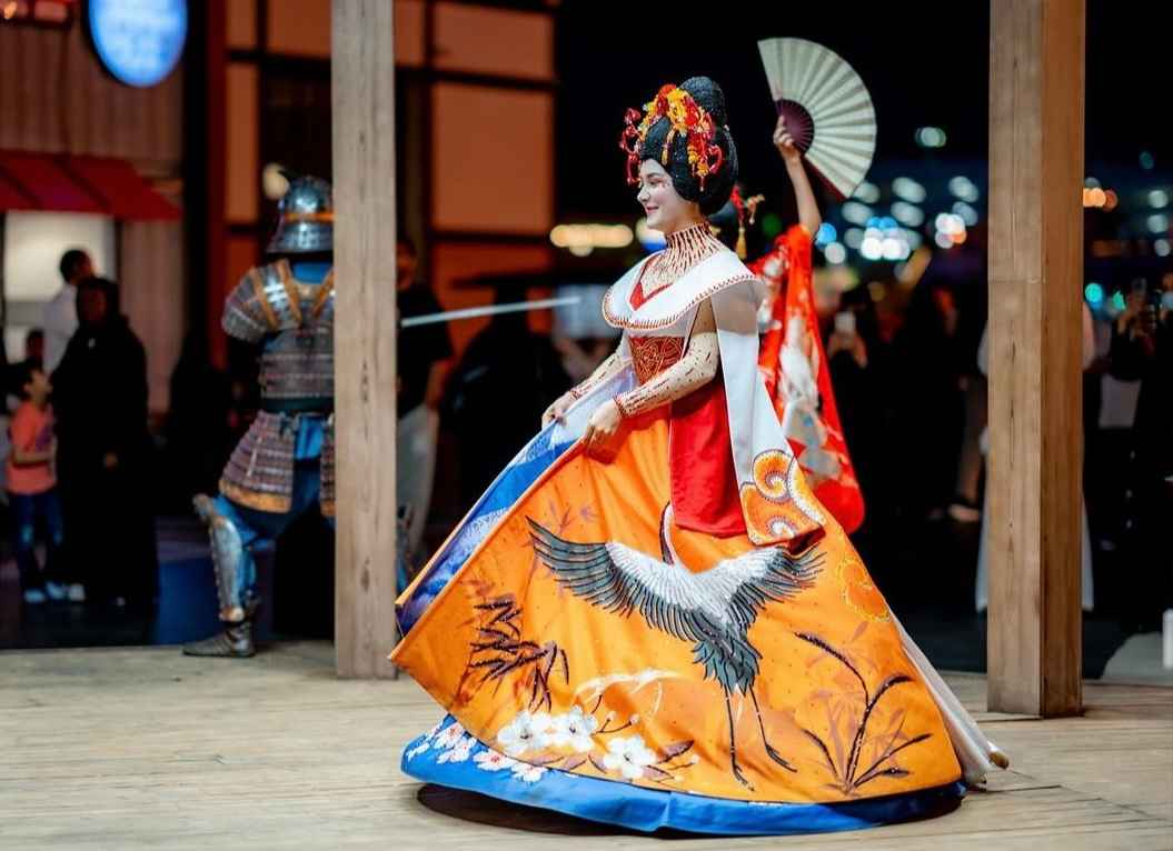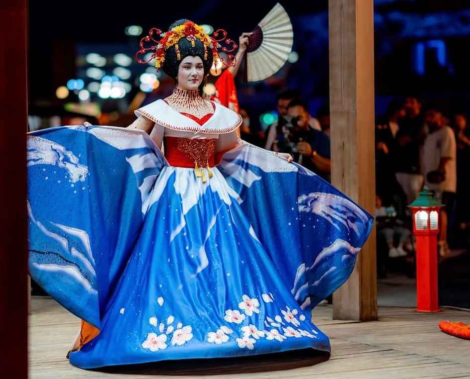 This magnificent figure instantly captivates with her stunning, fan-like backpiece, directly embodying the Japanese national flag, paired with an elaborately detailed kimono-inspired gown in a harmonious blend of crisp white, deep blue, and vivid orange, adorned with graceful cranes and mountain motifs. Her elegant floral headpiece and traditional white makeup complete an image of pure and living artistry. This act is an immersive experience which gracefully glides through your event, engaging guests with silent, captivating movements, elegant poses, and a serene presence that sparks admiration and wonder for Japanese culture.