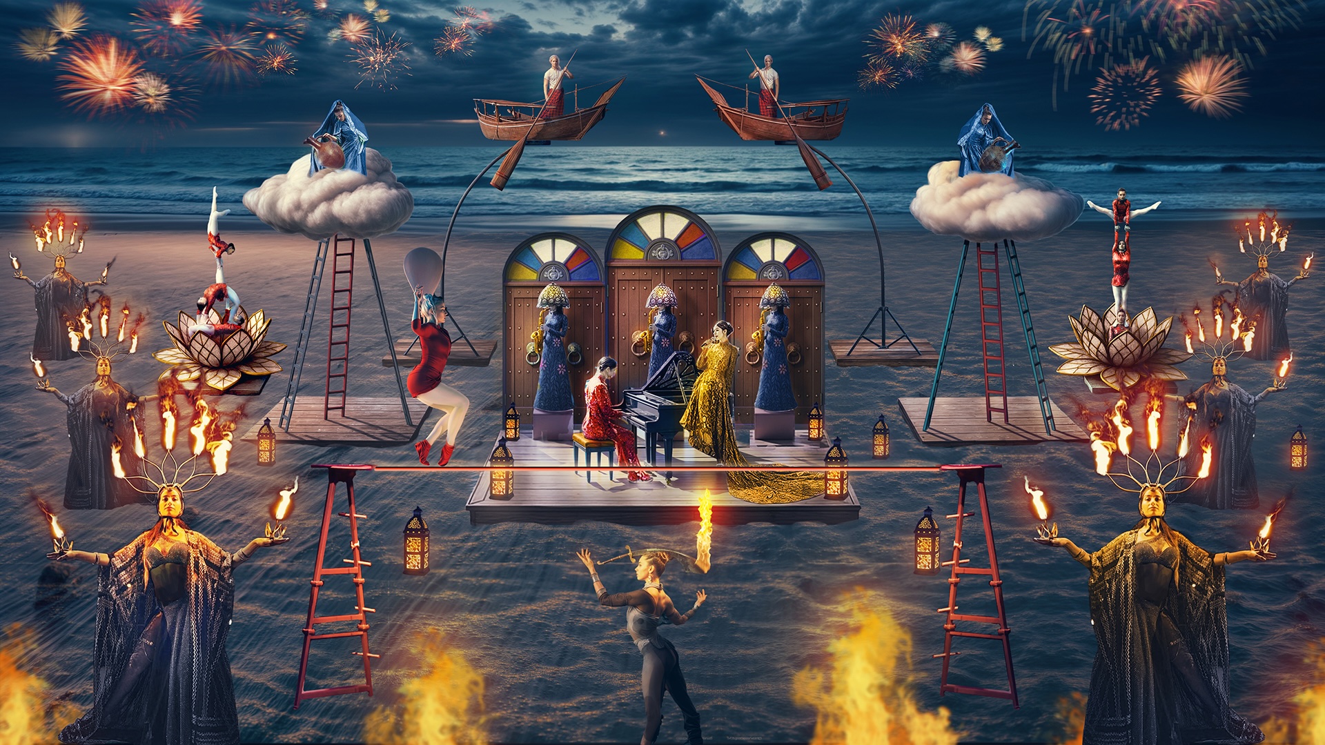 A large-scale open-space show structured as a series of visually rich episodes. Music, acrobatics, balance, fire, and movement come together as a single artistic composition. A contemporary stage language, thoughtful direction, and a high level of performance create a refined visual statement, enhanced by subtle cultural accents that can be adapted across different GCC contexts.