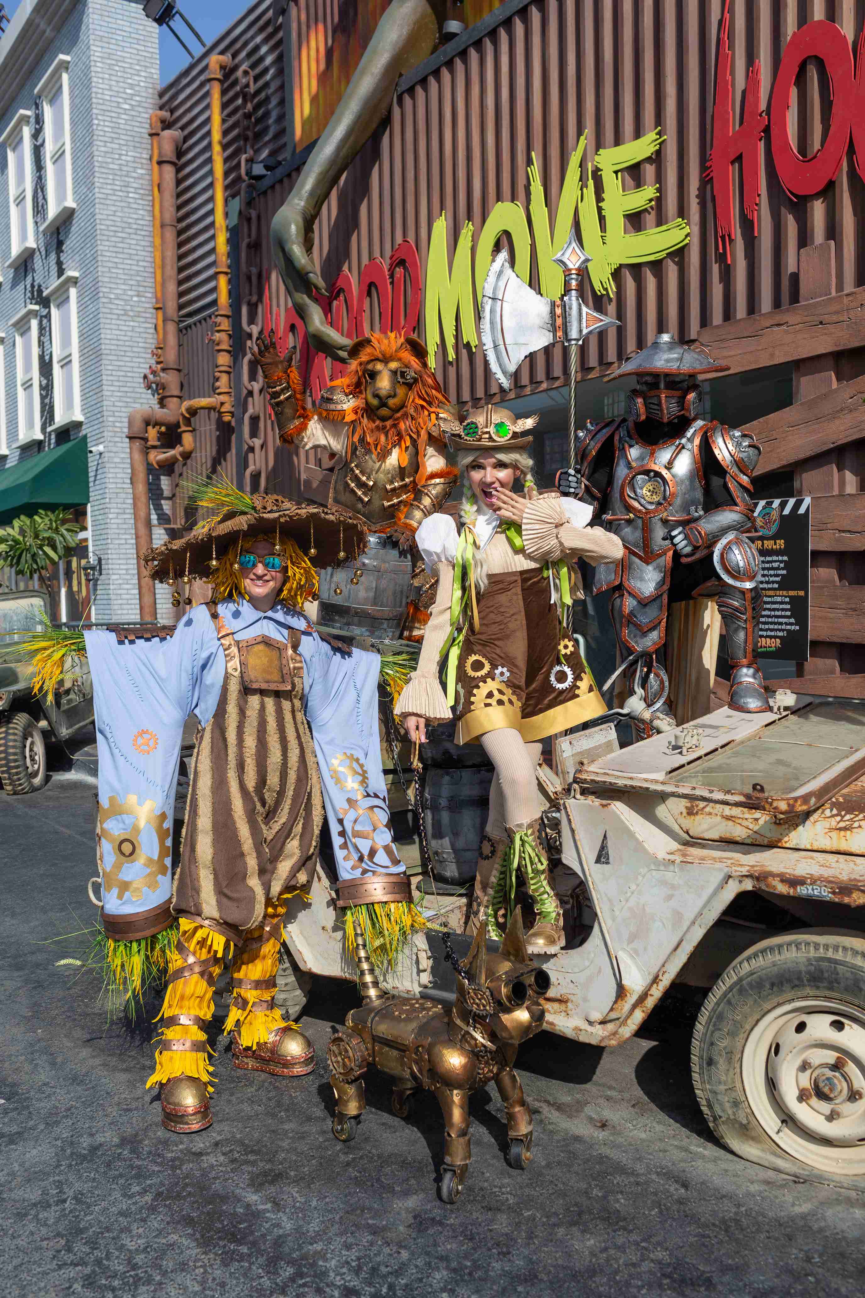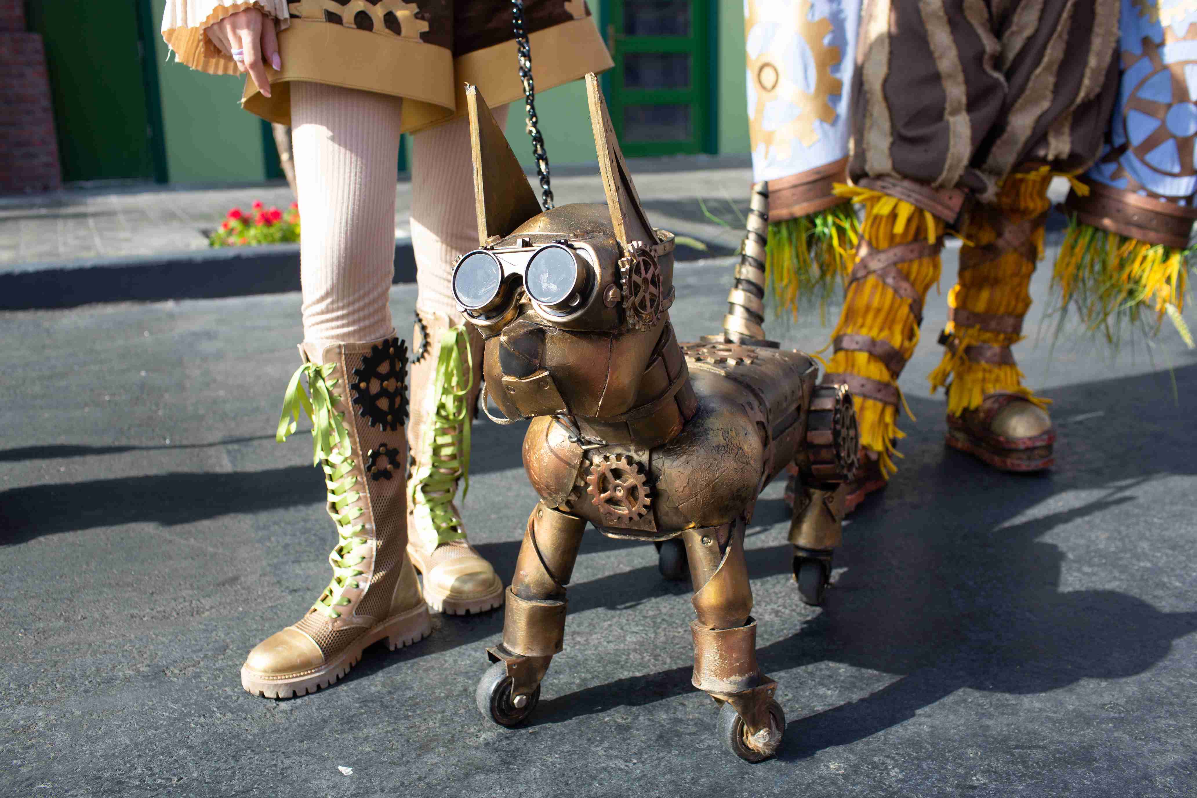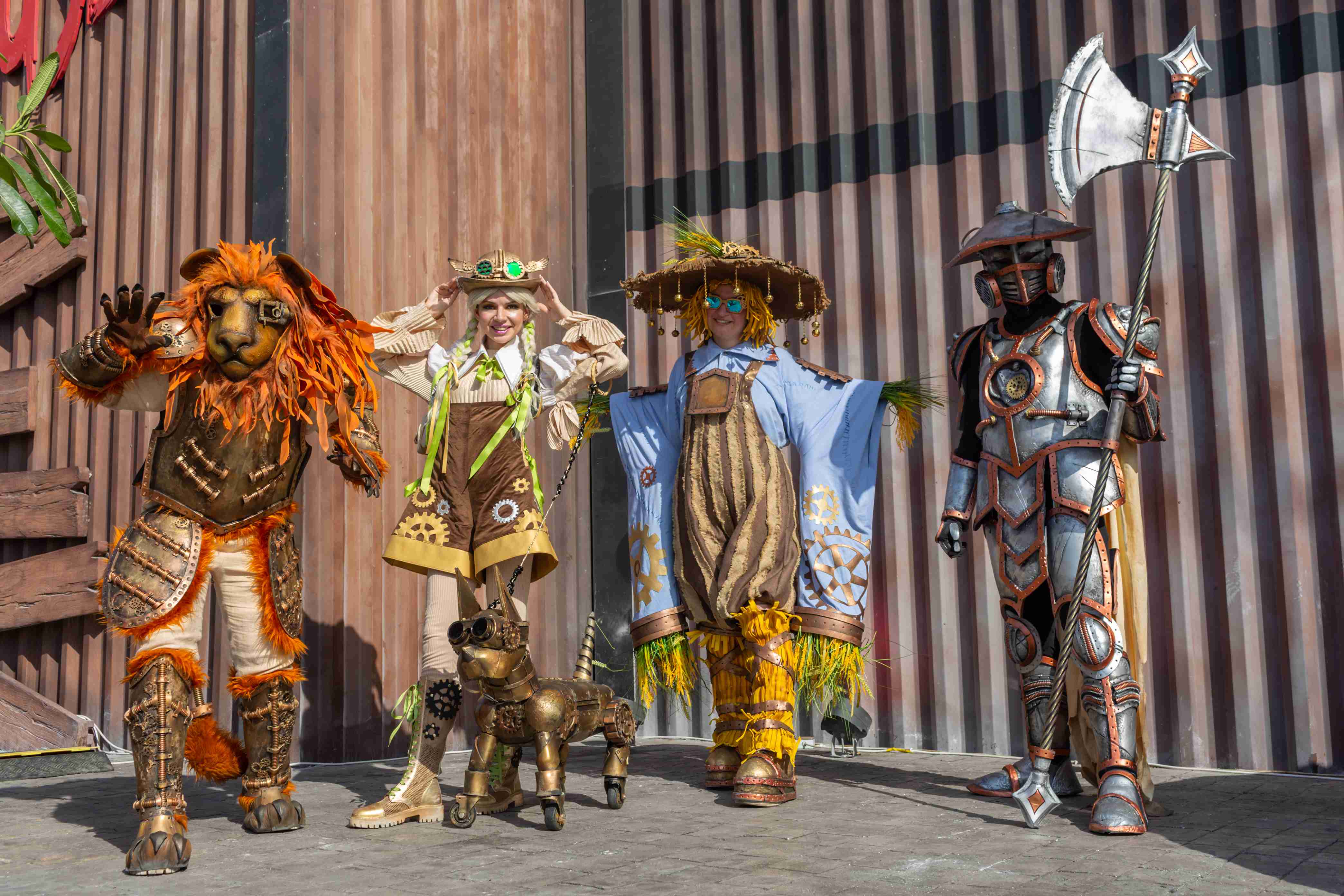 "Steam of Oz" is a mesmerizing steampunk reimagining of the classic tale, brought to life by four performers in richly detailed mechanical costumes. Intricate brass gears, leather harnesses, aviator goggles and sculptural armor blend with living masks and a clockwork canine to create a tactile, cinematic atmosphere. Presented as a roaming experience with four 20-minute sets, the show fuses theatrical movement, live musical motifs and playful guest interaction to captivate audiences across any venue. Each costume is handcrafted for both visual impact and functional mobility, allowing performers to pose, parade and engage while maintaining a polished, premium aesthetic.