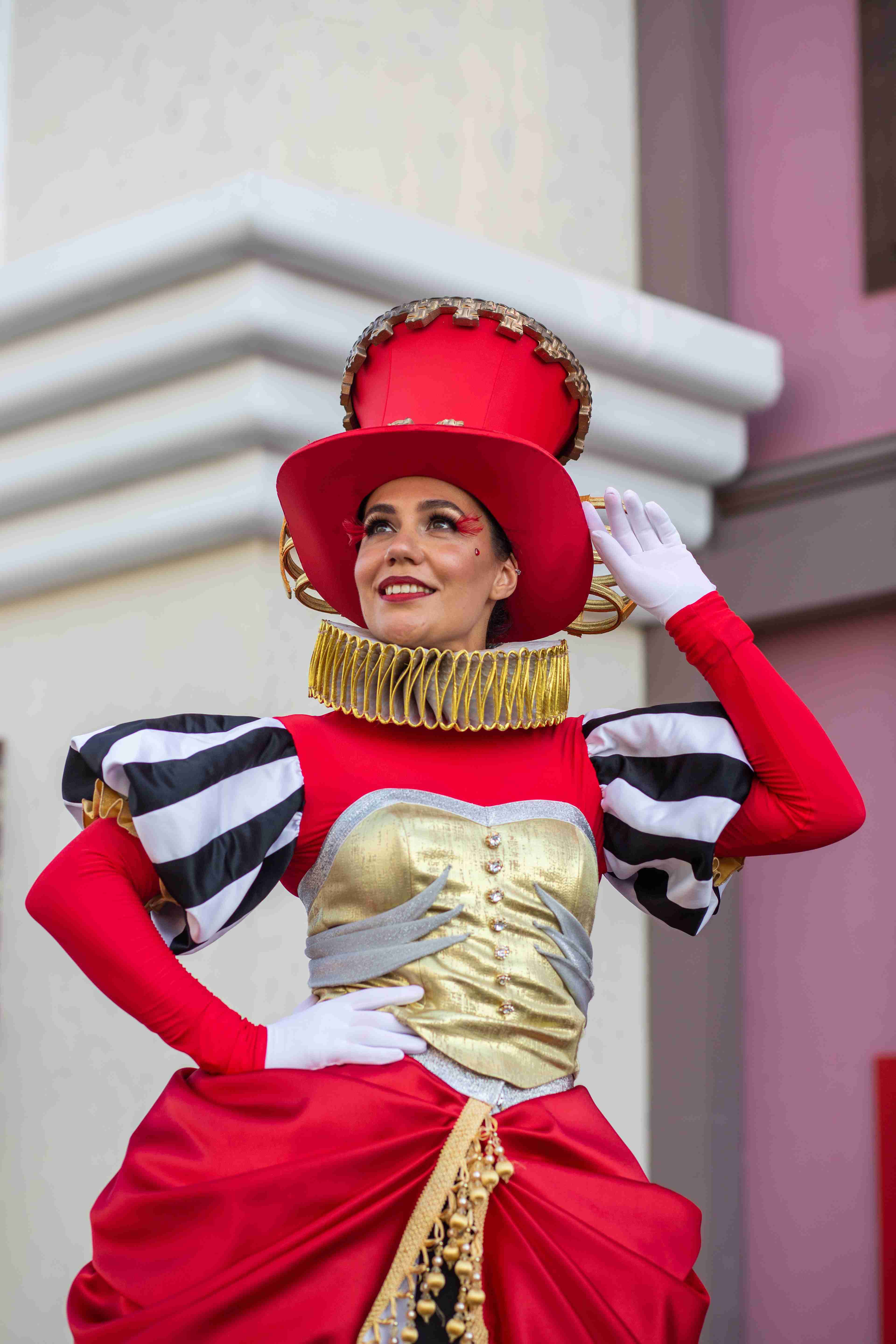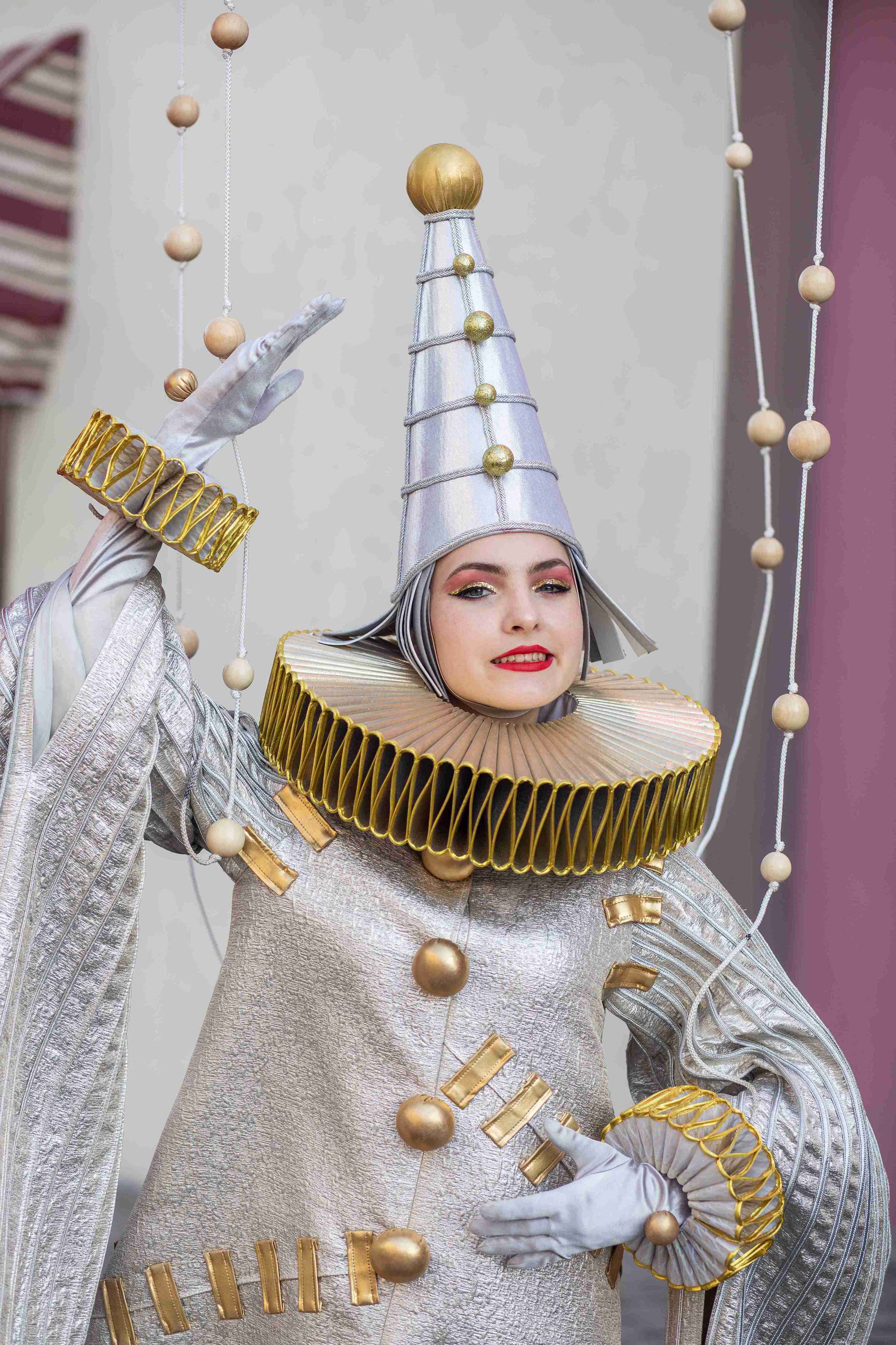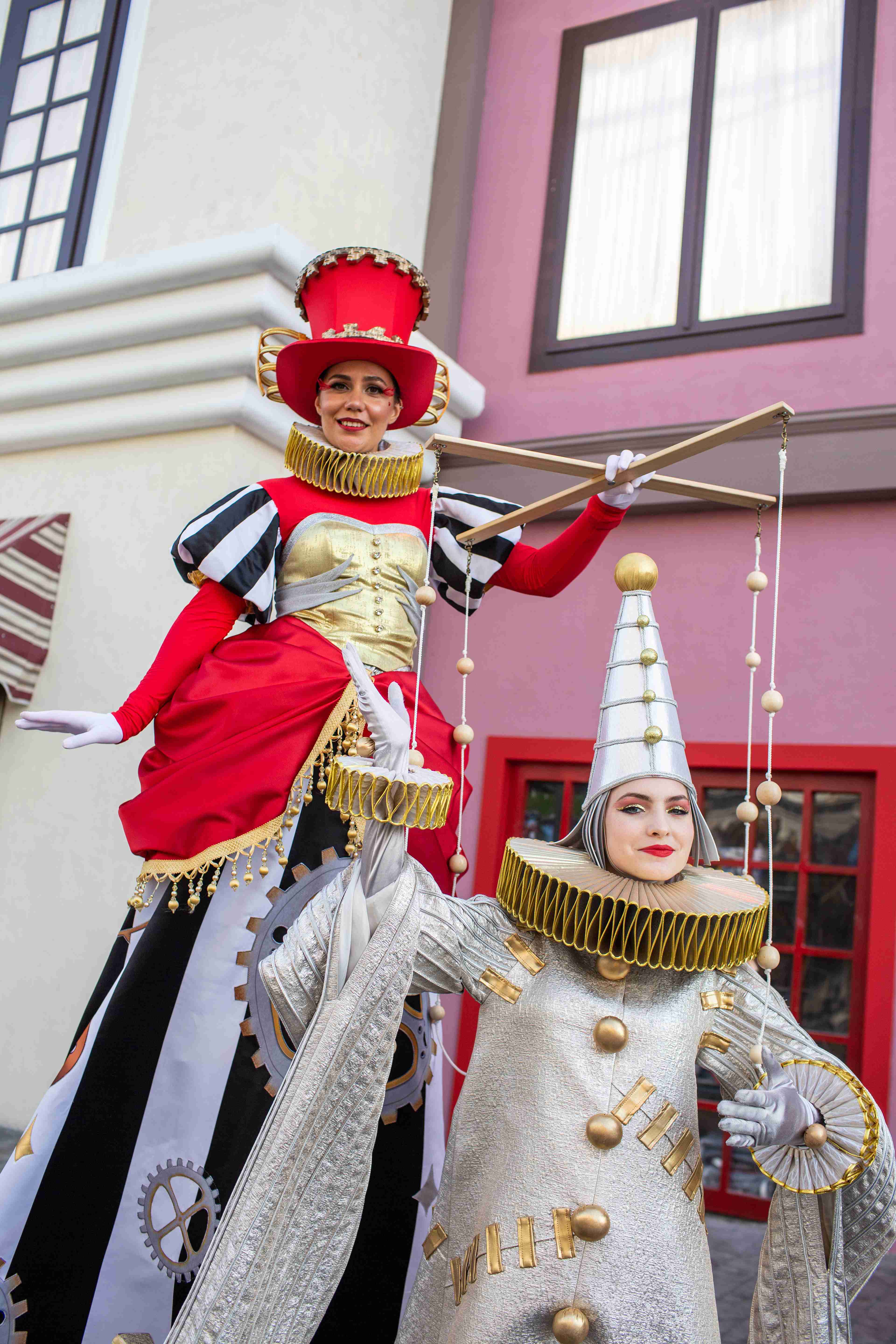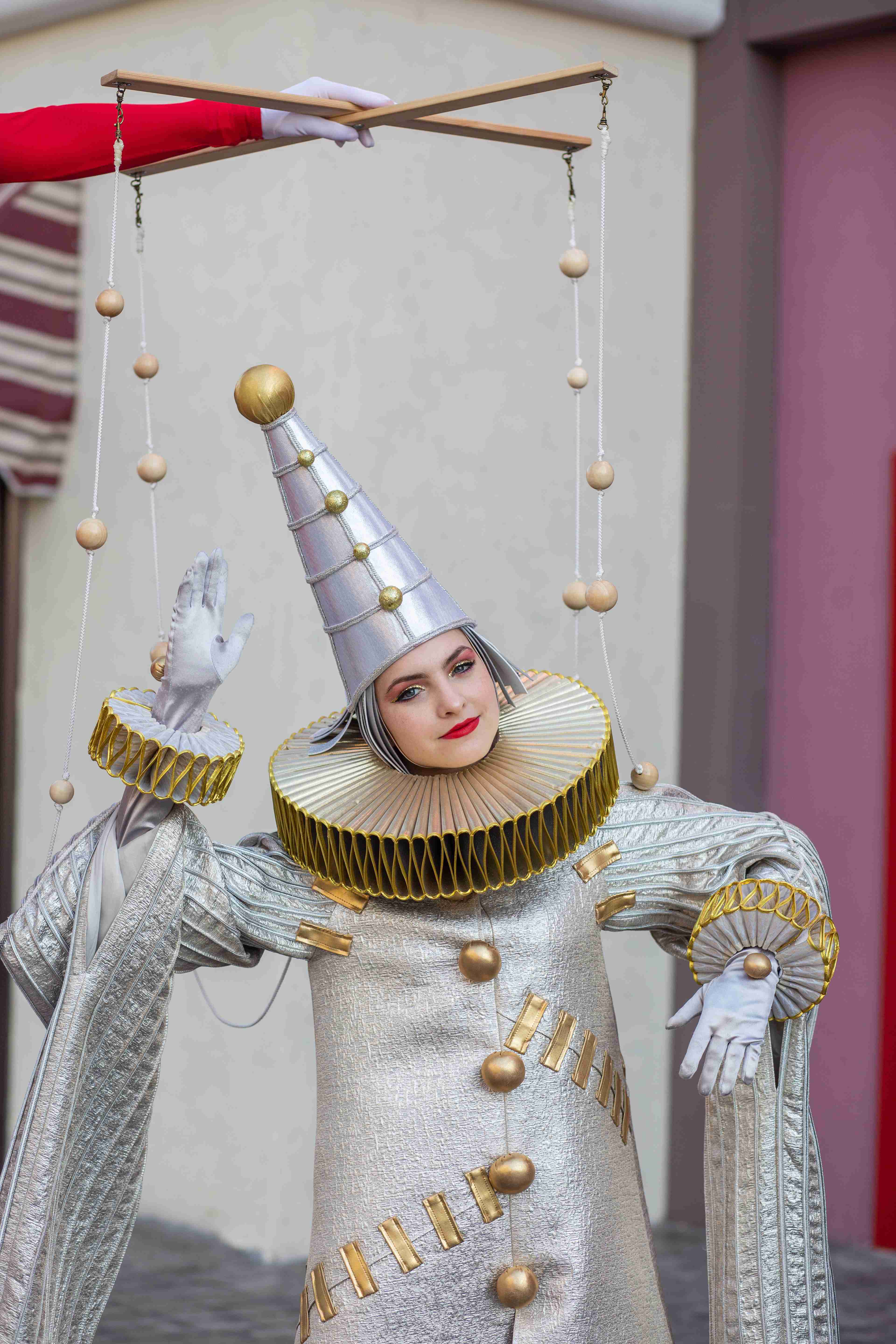 "The Marionette Reverie" is a mesmerizing roaming spectacle featuring two elegantly costumed performers who bring a surreal puppet theater to life. Their baroque-inspired outfits — towering ruffs, gold-accented bodices, bold red drapery and striking black-and-white stripes which create captivating silhouettes that dominate any space. One towering figure and a companion move in stylized, puppet-like choreography, linked by delicate suspended ornaments and a theatrical control rod that plays on the magic of manipulation and whimsy. Presented as four 20-minute roaming sets, the duo weaves gracefully through crowds, offering intimate interactions and picture-perfect moments. Ideal for gala arrivals, product launches, and high-profile receptions, this act injects venues with a cinematic mix of vintage circus glamour and contemporary avant-garde.