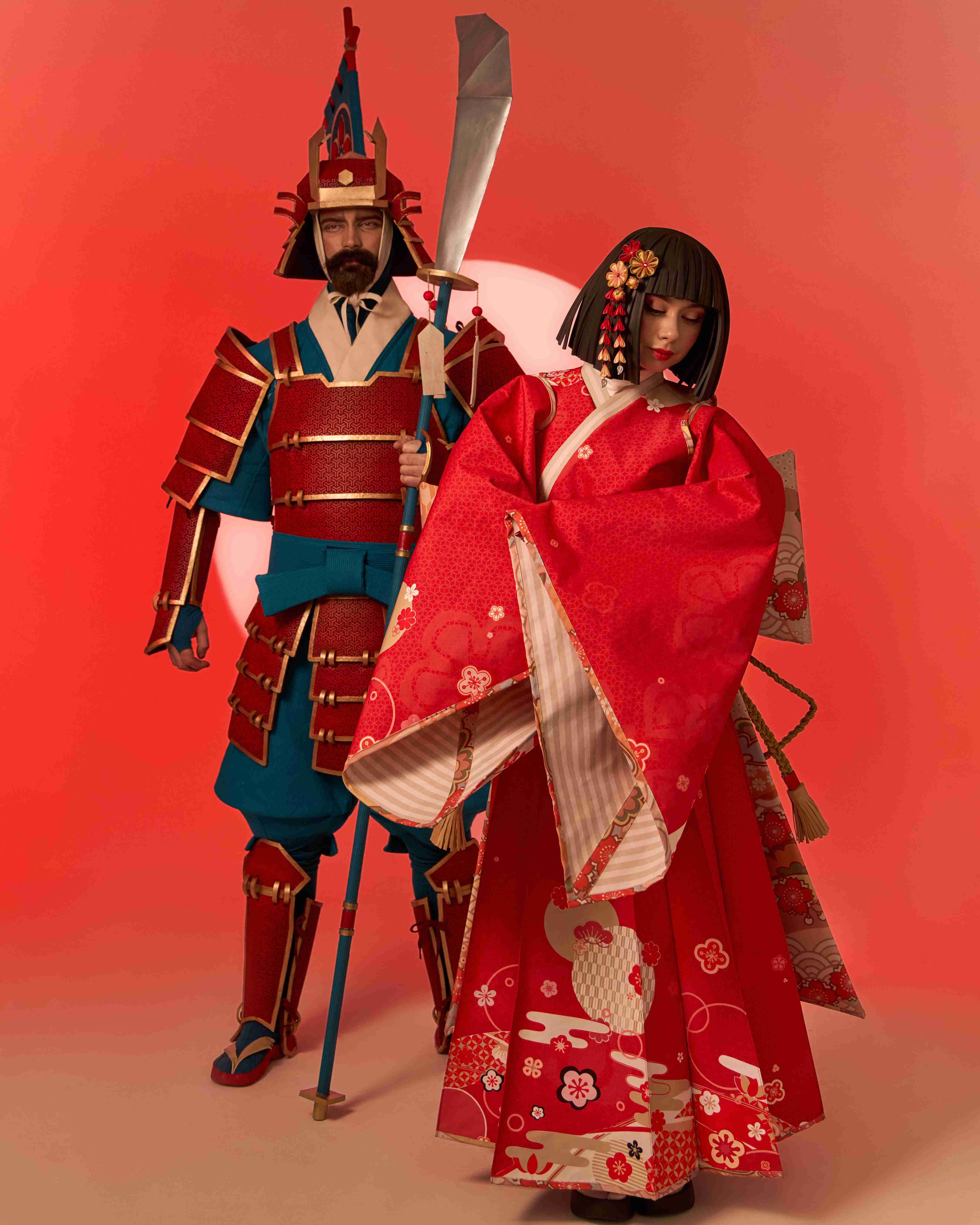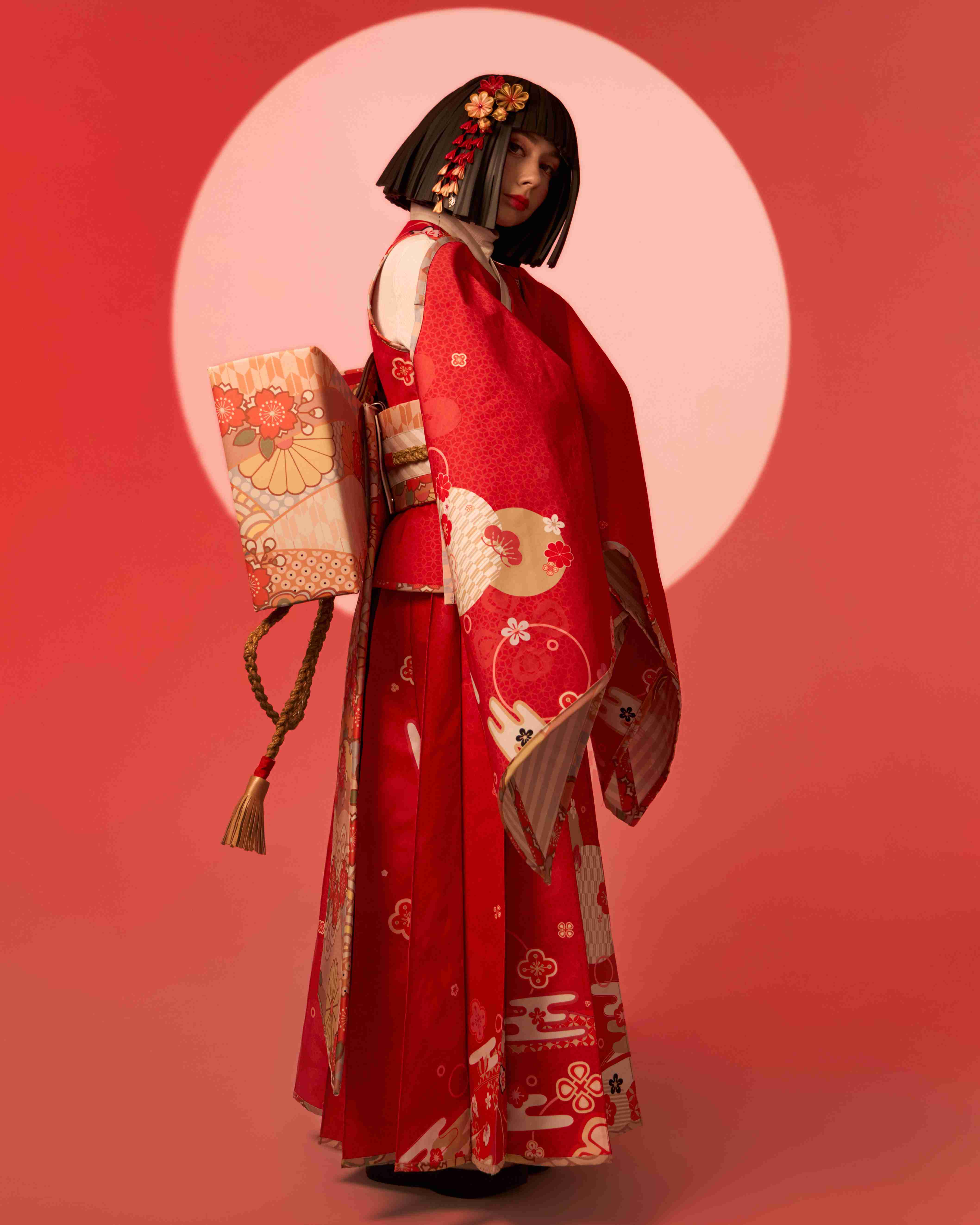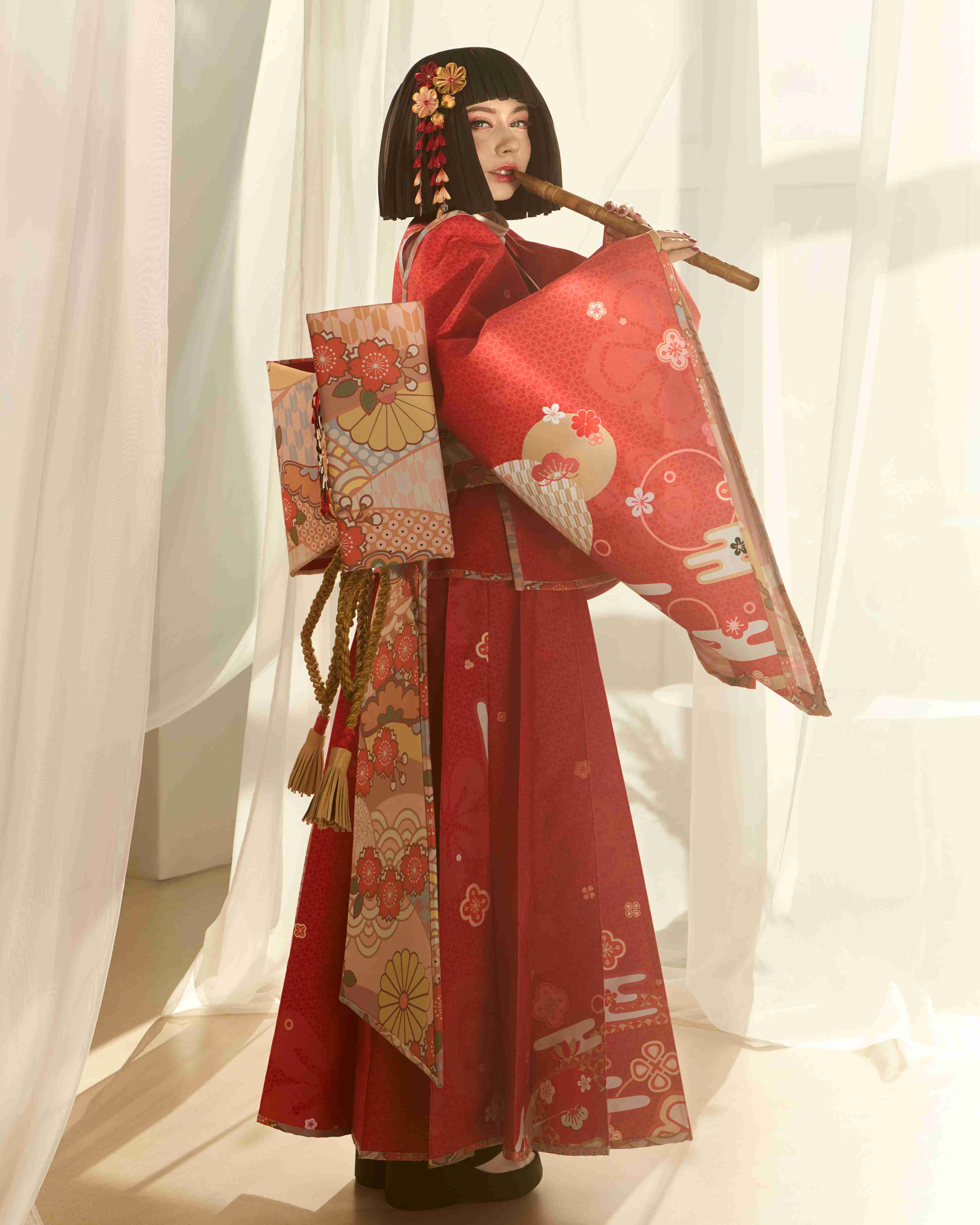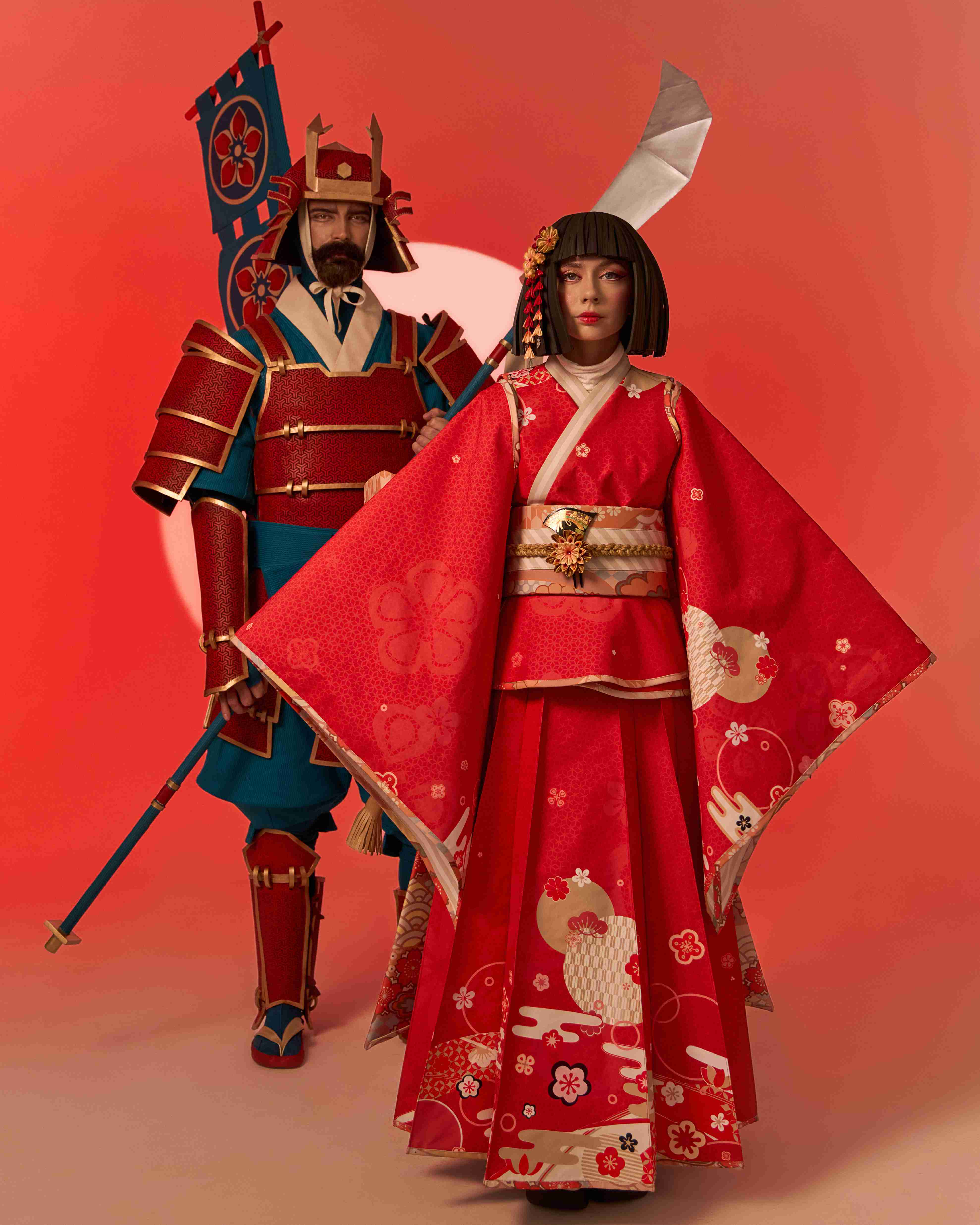 At the center of the procession is the main character, appearing on a platform shaped like an open book. Symbolic images emerge around her: the Crane Herald, opening the way and setting the rhythm of the story; dancers with umbrellas and fans, shaping the direction and pace of the movement; kitsune foxes, bringing twists and unexpected shifts; and samurai with bamboo staffs, embodying momentum and clarity.