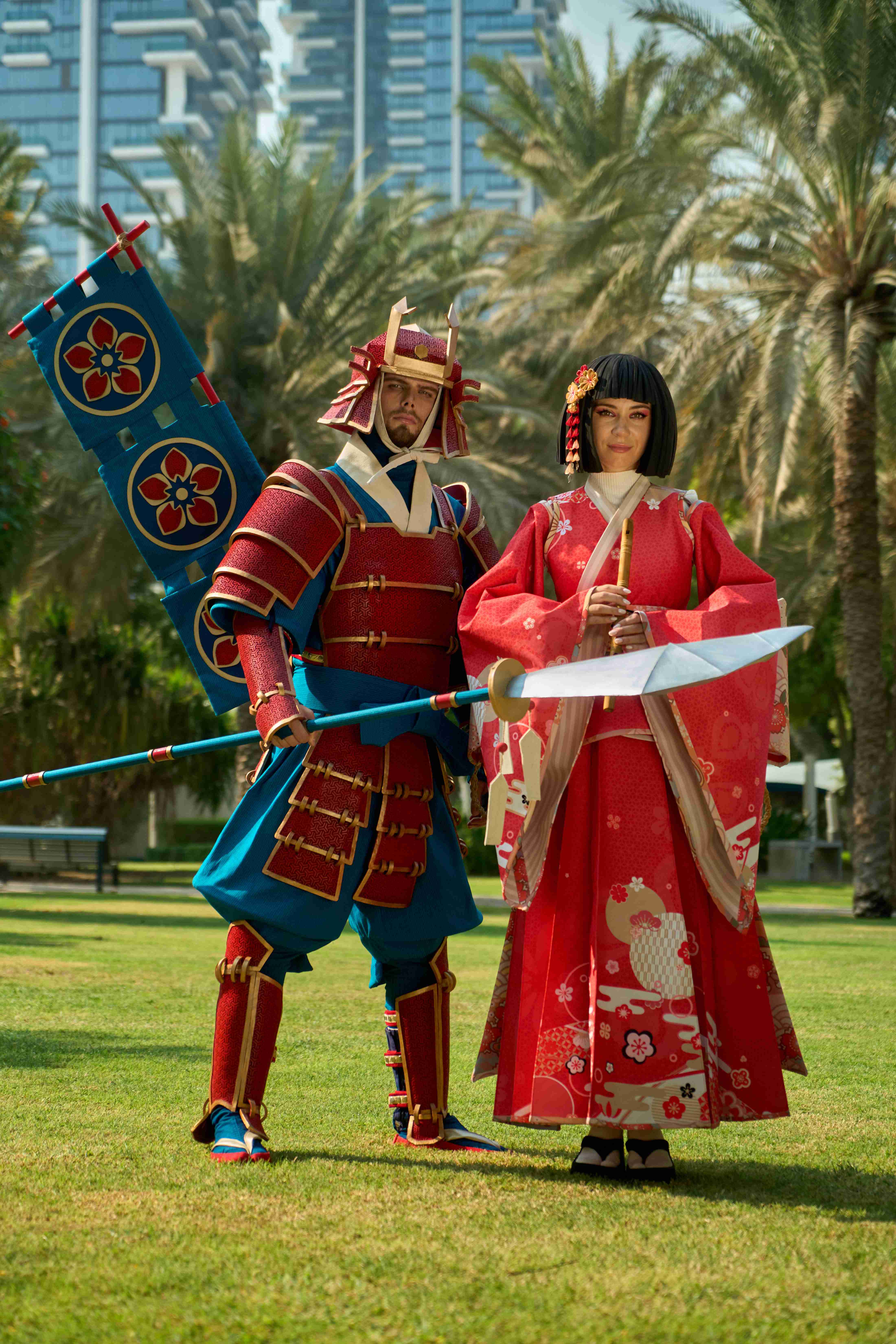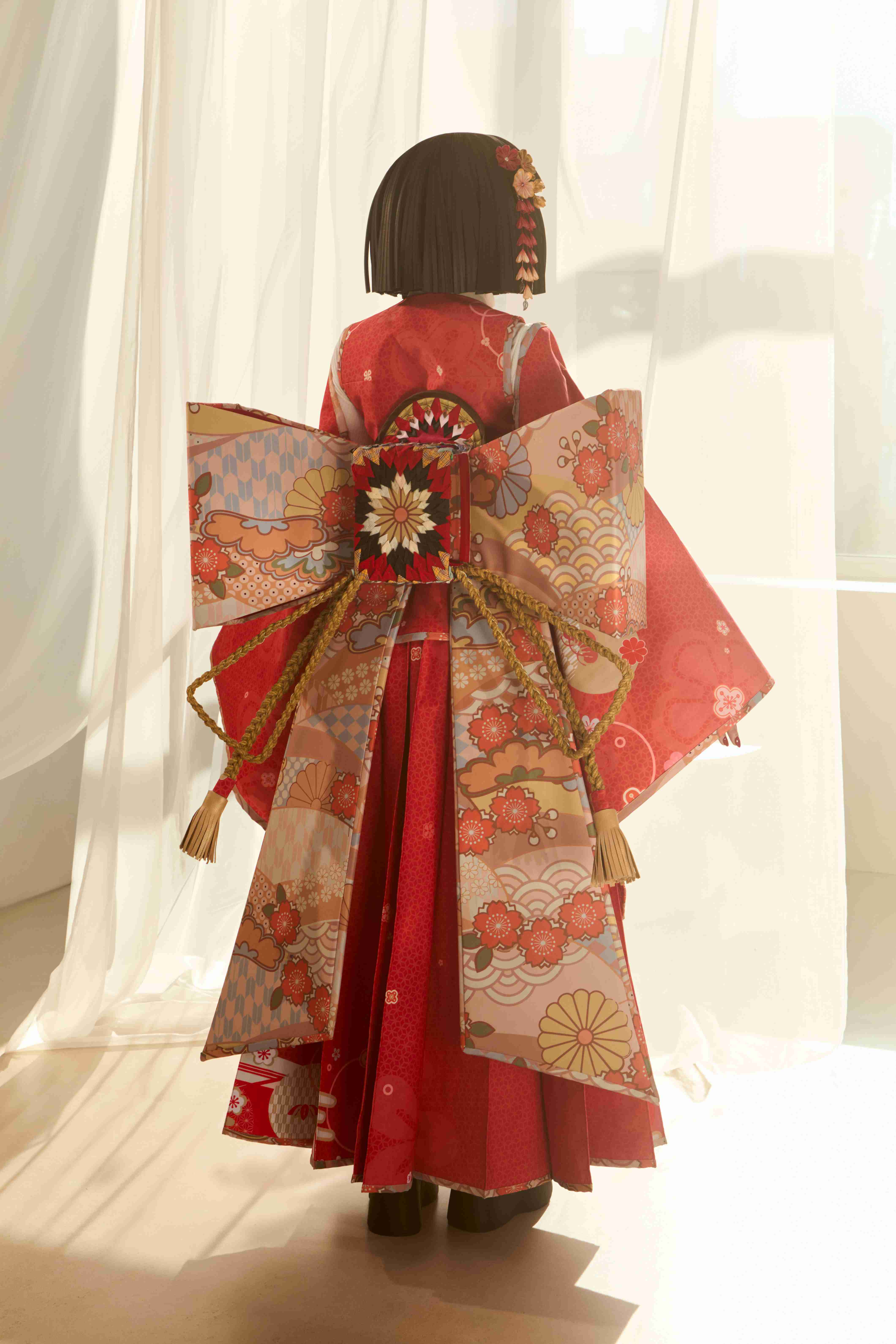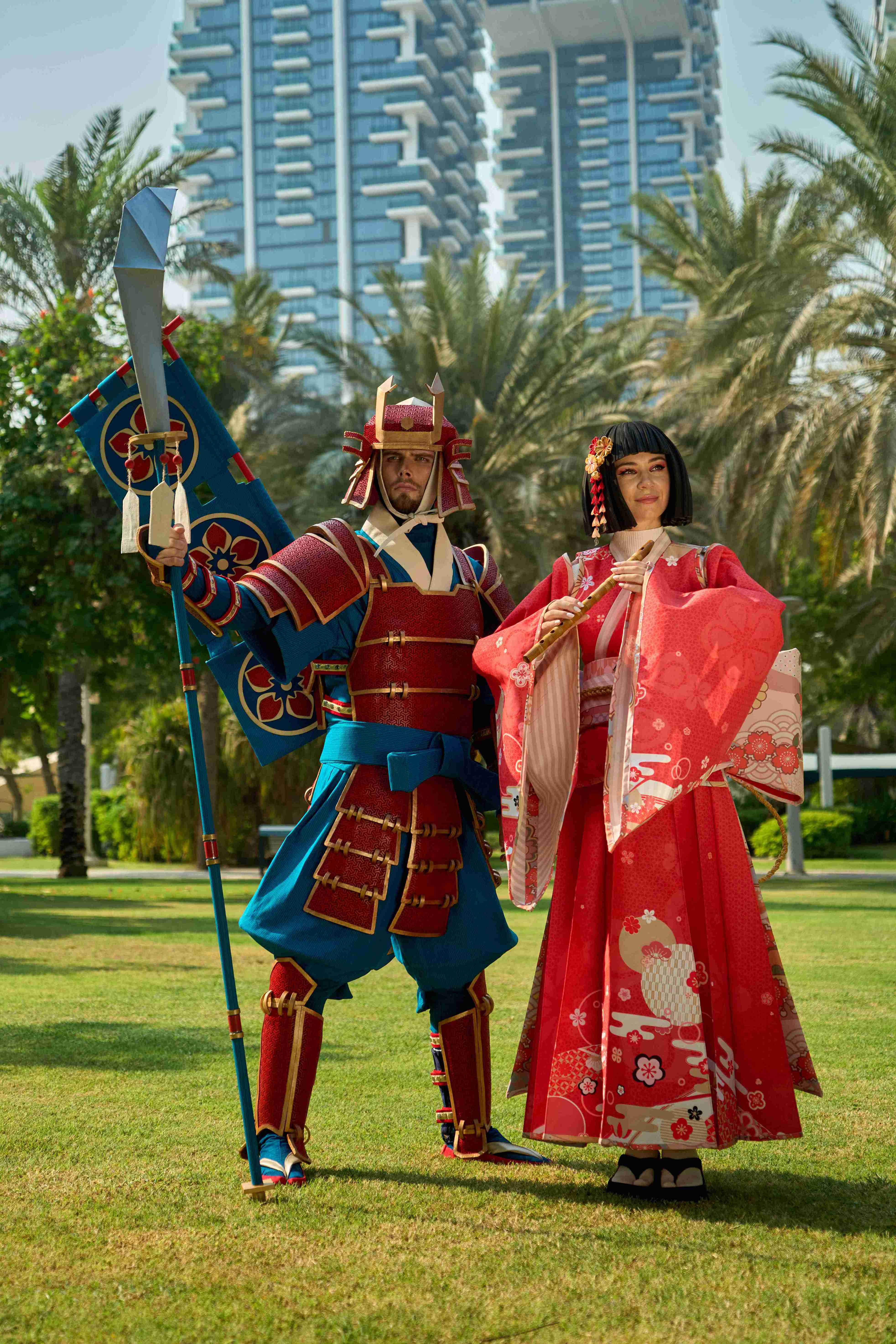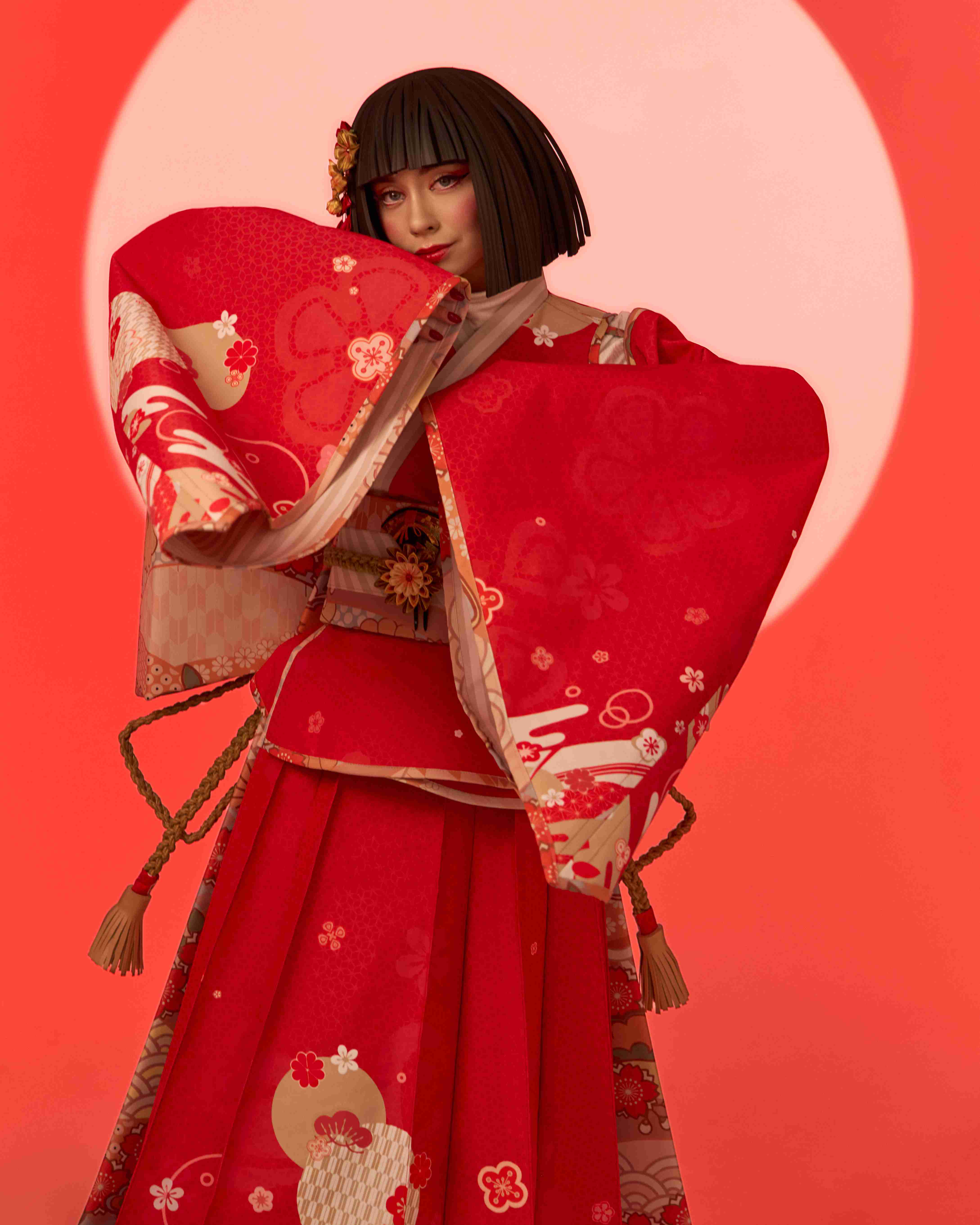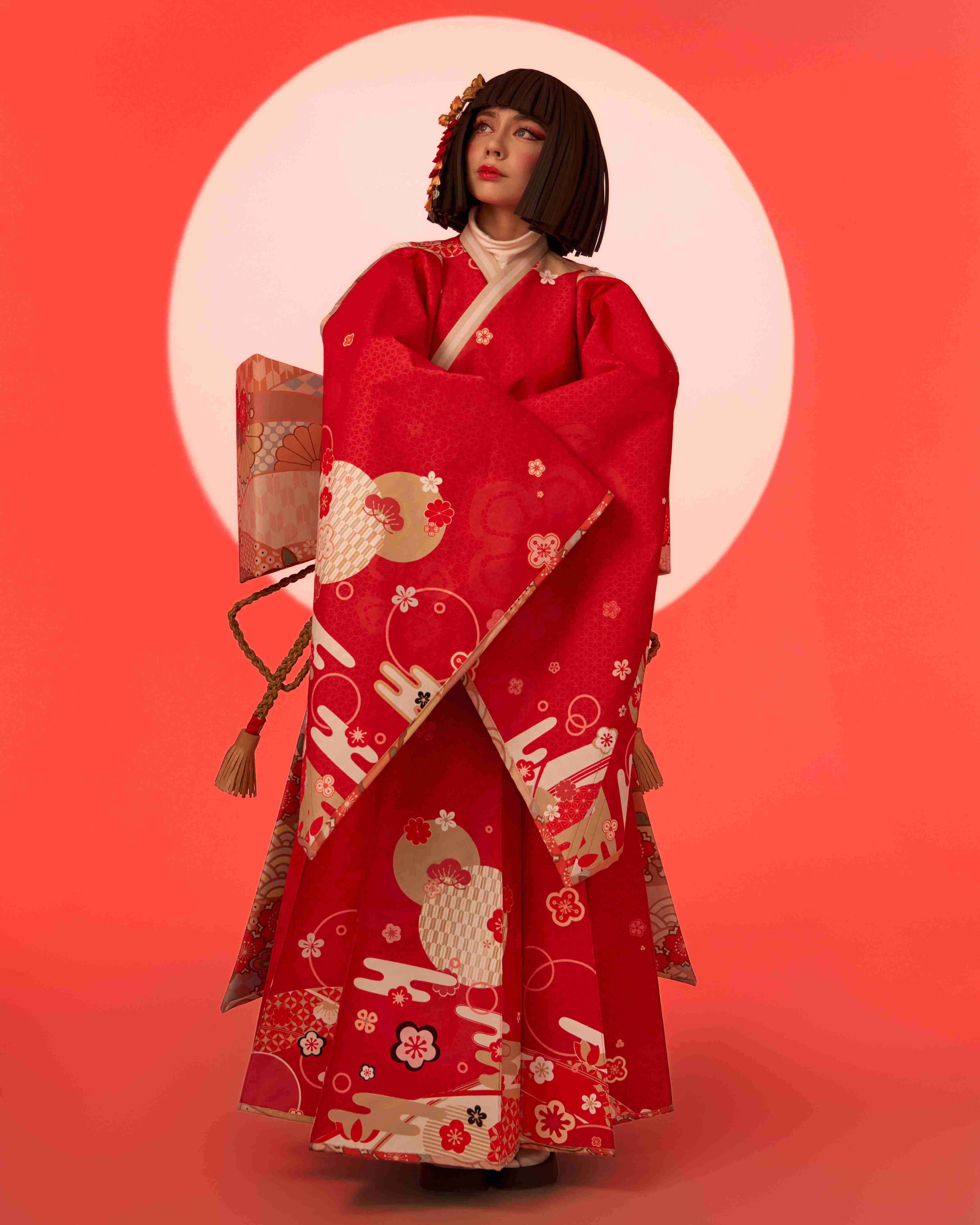 At the center of the procession is the main character, appearing on a platform shaped like an open book. Symbolic images emerge around her: the Crane Herald, opening the way and setting the rhythm of the story; dancers with umbrellas and fans, shaping the direction and pace of the movement; kitsune foxes, bringing twists and unexpected shifts; and samurai with bamboo staffs, embodying momentum and clarity.